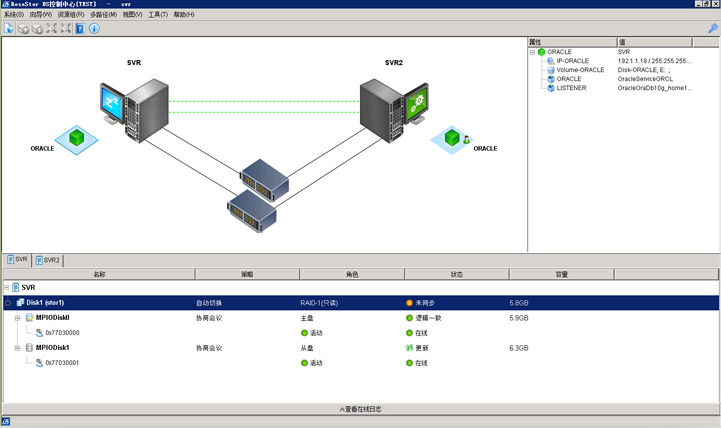 共享盘柜方式的双机容错方案中,数据存放在共享的磁盘阵列柜上,形成了单点故障。一旦其共享磁盘(磁盘阵列)出现问题,即使服务器没有问题,整个群集或双机都不可能继续提供应用业务。因此希望接上2个磁盘阵列,这两个磁盘阵列数据实时一致,当其中一个盘柜的磁盘出现问题,另外一个磁盘阵列的磁盘的数据继续可用,从而保证业务继续可用,不会中断。